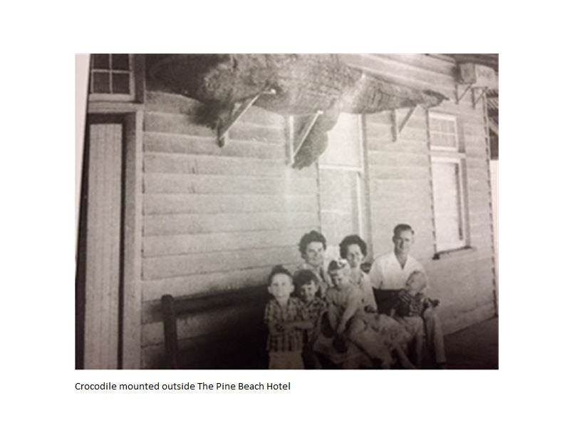 Familiar at the Pine Beach Hotel for many years was a 19 foot (5.8m) crocodile caught in the Mills fish trap in Zilzie in 1909. It was preserved and first put on display at the Grand Central Hotel but when the Begg family moved to the Pine Beach Hotel, the crocodile went with them. It stayed mounted outside the Pine Beach for 50 years.